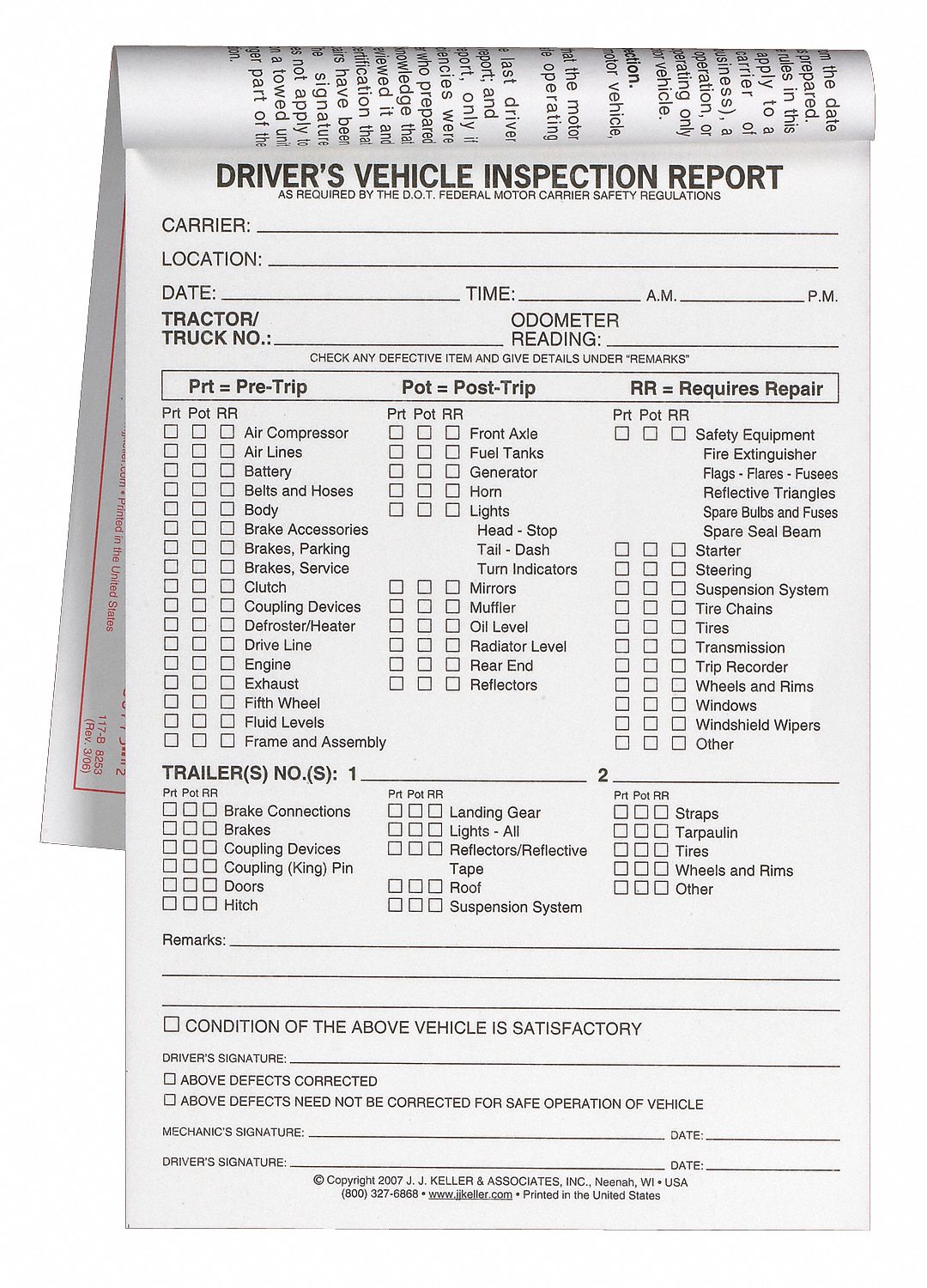 Jj Keller Driver Vehicle Inspection Form Carbonless 2 Plies Tractor Trailer Truck 38d299 8253 Grainger